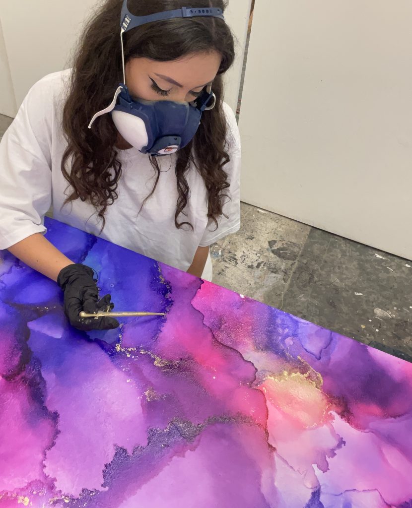 Her primary medium are alcohol inks, which are dye-based highly saturated pigments suspended in isopropyl alcohol. While alcohol inks are traditionally used on smaller surfaces, Lori has adapted her technique to larger-scale works on canvas.